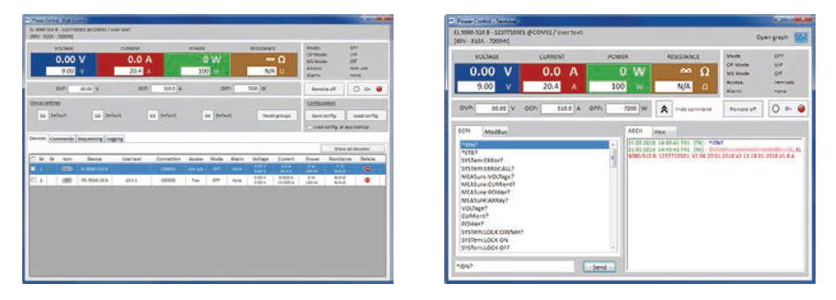 通過電腦遠程控制本產品,可以使用隨附產品的EAPower Control軟件。它可同時應用于多臺不同或同型號的PS 9000 2U 系列產品上,對其監控與控制。本軟件還有一固件更新工具,以及數據記錄功能,和用半自動表格處理來控制產品的特征。對于更復雜的應用,還提供有一個完整的編程文件,以及可直接應用的LabView VIs。PS 9000 2U所有型號支持通用SCPI指令語言,以及ModBus RTU通訊協議。但是帶3 W選項功能的型號,通過GPIB端口僅能使用SCPI語言。