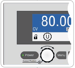 產品所有重要信息都清晰地顯示在彩色的TFT顯示屏上。通過該顯示器,電壓與電流的實際輸出值和預設值,(CV, CC, CP) 實際控制狀態與其它狀態,報警與設置菜單的設定,都清晰顯示出來。為使旋鈕可以調節參數,只需按一下該旋鈕,就可更換數值小數點后的光標位置。所有這些特性都有助于操作者的便利性。其面板鎖定功能可鎖住整個面板,從而保護產品與連接負載免受意外誤用。