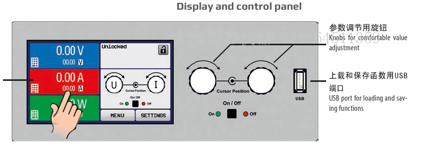 設(shè)定與實際輸出電壓、電流與功率都清晰顯示于圖形顯示器上。彩色的TFT屏幕為點觸式,用一個手指就能控制所有功能。通過旋鈕或者數(shù)字鍵盤直接輸入?yún)?shù),也可調(diào)節(jié)設(shè)定電壓、電流、功率或阻值(內(nèi)阻模擬)。若想防止意外操作,可鎖定所有操作鍵。