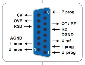 本系列產品后板可選擇安裝隔離模擬接口。該模擬接口具有一模擬輸入腳,接上0 V...10 V或0 V...5 V電壓,可設置...100%的輸出電壓、電流與功率。要監控輸出電壓與電流,可給模擬輸出腳接上0 V...10 V或0 V...5 V來完成。此外 ,還有幾個輸入腳和輸出腳,可用來控制和監控產品狀態。